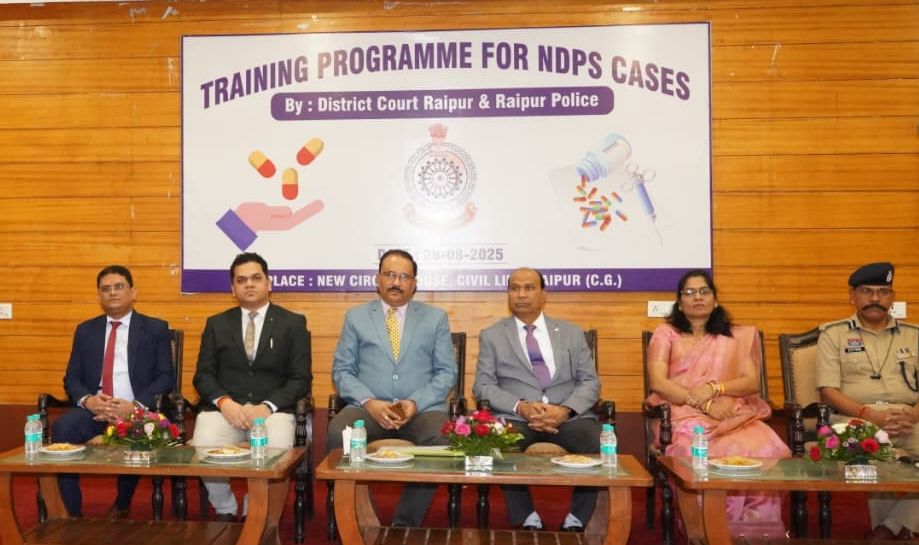रायपुर- दिनांक 28.08.2025 को न्यू सर्किट हाउस सिविल लाईन रायपुर के सभागार में पुलिस एवं माननीय न्यायालय के संयुक्त तत्वाधान में एन.डी.पी.एस. एक्ट की विवेचना के संबंध में पुलिस अधिकारियों के लिये मार्गदर्शन सत्र का आयोजन किया गया। मुख्य अतिथि के रूप में प्रधान जिला एवं सत्र न्यायाधीश रायपुर बी.पी.वर्मा., विशेष न्यायाधीश एनडीपीएस एक्ट/एससी-एसटी एक्ट पंकज कुमार सिन्हा, जिला एवं अतिरिक्त सत्र न्यायाधीश किरण थवाईत, जिला एवं अतिरिक्त सत्र न्यायाधीश गिरीश मण्डावी तथा मुख्य न्यायिक मजिस्ट्रेट आनंद कुमार सिंह एवं पुलिस उप महानिरीक्षक एवं वरिष्ठ पुलिस अधीक्षक रायपुर डॉ. लाल उमेद सिंह सहित जिले के समस्त अतिरिक्त पुलिस अधीक्षक अधीक्षक, नगर/उप पुलिस अधीक्षक, थाना प्रभारी एवं प्रत्येक थाना से विवेचक एवं प्र.आर. माल मोहर्रिर सहित कुल 150 पुलिस अधिकारी/कर्मचारी उपस्थित रहे।